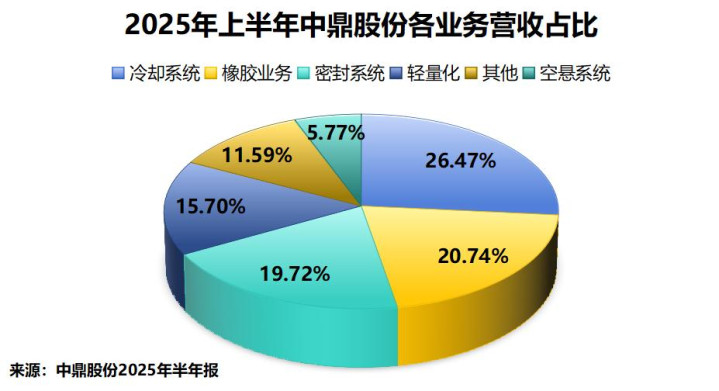 这要结合业务来说。在中鼎股份现有业务版图中,为它贡献营收的主要是冷却系统、橡胶、密封系统、轻量化四大板块,2025年上半年,公司这四大业务累计营收占比达83%。