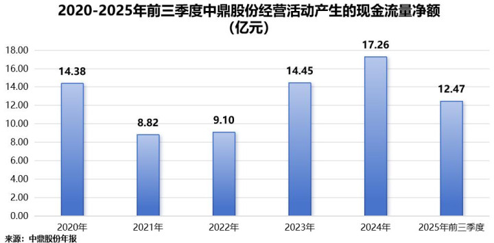2020-2025年前三季度,中鼎股份经营活动现金流持续为正,整体呈现稳健态势。截至2025年前三季度,公司经营活动现金流量净额达12.47亿元。