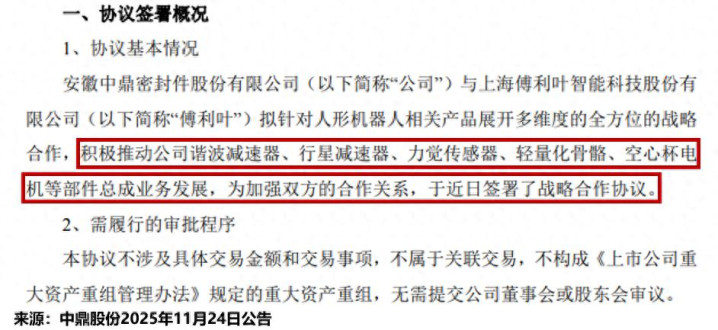 11月24日,公司再次公告与傅利叶智能正式签署战略合作协议。双方将围绕谐波减速器、行星减速器、轻量化骨骼等核心部件总成业务,在产品开发等层面建立长期合作。